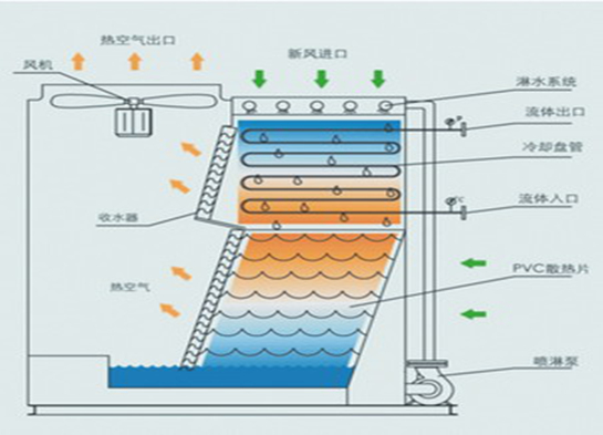 被冷卻水通過盤管與管外噴淋水和空氣進行熱質(zhì)交換,避免了被冷卻水與空氣直接接觸而導(dǎo)致的水質(zhì)污染。由于管外有通過PVC填料預(yù)冷卻的噴淋水,其換熱效果明顯優(yōu)于空冷器。如用于冷凍機終端散熱,冷卻塔的盤管和冷凍機的熱交換器連接在一起,形成一個封閉的循環(huán)系統(tǒng),而防止了空氣中的如硫化物氣體、灰塵、微生物等對循環(huán)系統(tǒng)的腐蝕,并且冷凍機的熱交換器不會結(jié)水垢,免除了冷凍機的除垢保養(yǎng),使冷凍機節(jié)電,運行壽命增長。