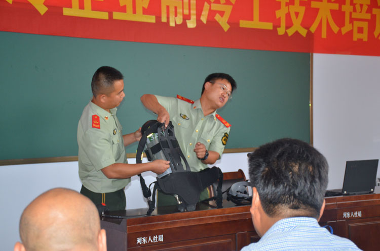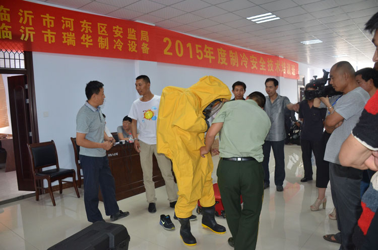 培訓(xùn)于上午8:30正式開始,此次邀請到河?xùn)|區(qū)消防大隊隊長孟晉來講演重型防護(hù)服及正壓式呼吸器的原理及使用。講解原理知識的同時實地試穿及演練,讓每一位制冷工作人員熟悉掌握重型防護(hù)服的安全使用。氨制冷系統(tǒng)的使用最大的不足便是它的安全隱患,如何保障制冷系統(tǒng)的安全是企業(yè)必須學(xué)習(xí)及掌握的。