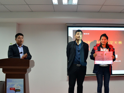 瑞華制冷工程部總經(jīng)理陳現(xiàn)富頒布微信文章“創(chuàng)作名星”獎(jiǎng),榮獲此獎(jiǎng)項(xiàng)的是銷(xiāo)售部陳鳳銘。