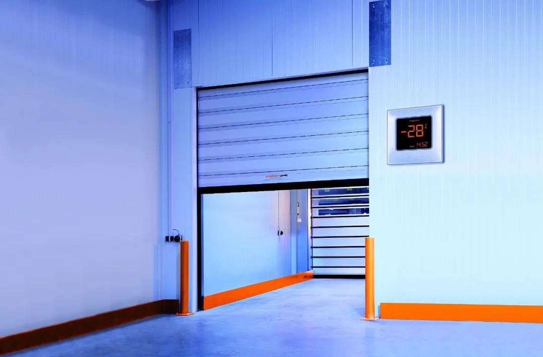 4)卷簾加電動冷庫門。這種設置是在庫體外側(cè)采用快速卷簾(有的帶保溫或不帶保溫,提升速度為1.2~2.5m/s),可以通過地磁、雷達、遙控或拉繩開啟,在庫體內(nèi)側(cè)安裝有普通電動冷庫門。在貨物進出過程中,電動門一直開啟,靠快速卷簾隔斷庫內(nèi)外,進出貨完畢時再將庫內(nèi)側(cè)冷庫門關(guān)閉。這種方式適合于進出貨頻繁的冷庫。